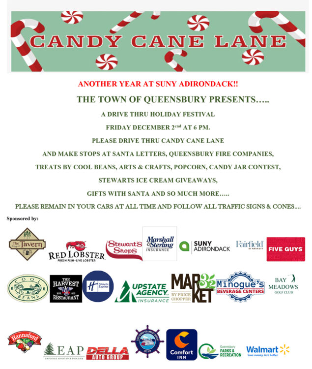 AND MAKE STOPS AT SANTA LETTERS, QUEENSBURY FIRE COMPANIES, TREATS BY COOL BEANS, ARTS & CRAFTS, POPCORN, CANDY JAR CONTEST, STEWARTS ICE CREAM GIVEAWAYS, GIFTS WITH SANTA AND SO MUCH MORE…..